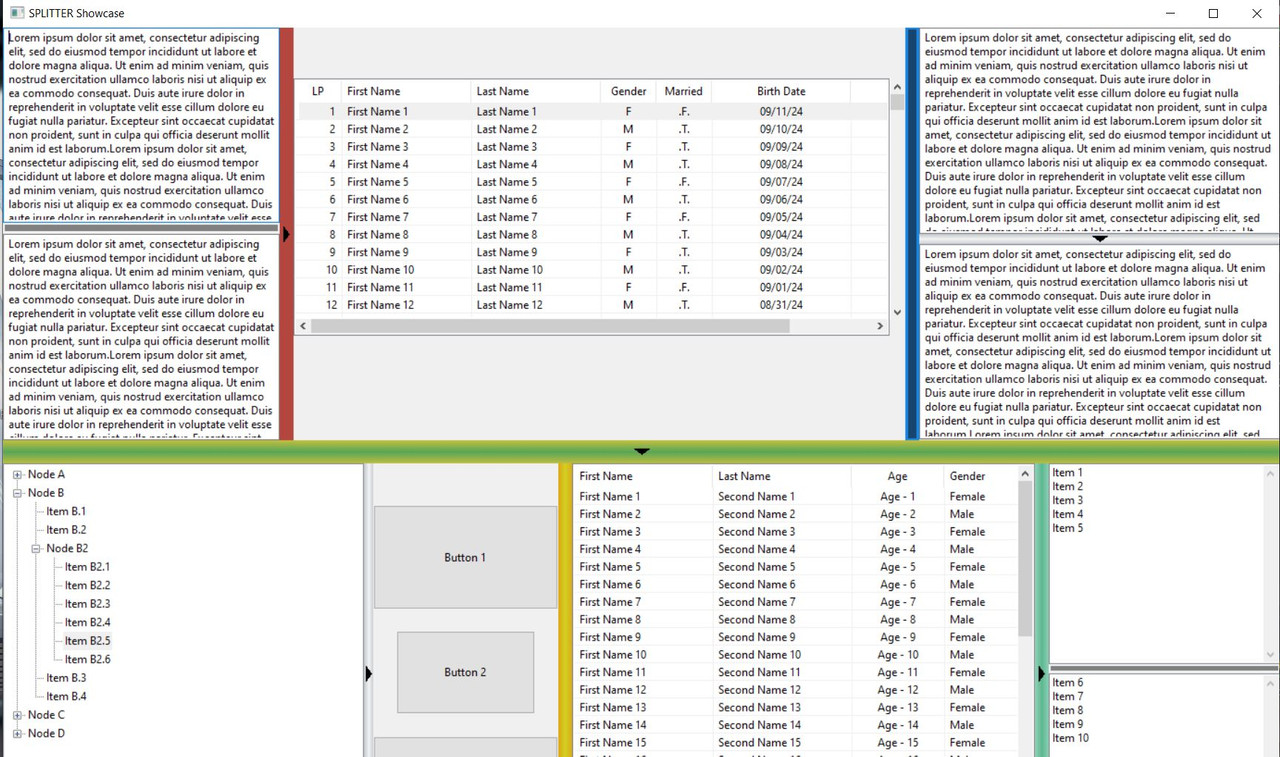 - aLeft Get/Set left (or top) controls of a splitter - aRight Get/Set right (or bottom) controls of a splitter - nLeftLimit Get/Set left (or top) limit of a splitter - nRightLimit Get/Set right (or bottom) limit of a splitter - lShowArrow Set wheter arrow on a splitter is displayed - lUseHover Set wheter hover effect on a splitter is applied - lUseGradient Set wheter a gradient is used to paint a splitter instead of flat color - color Get/Set an RGB value corresponding to a splitter's foreground color - bcolor Get/Set an RGB value corresponding to a splitter's background color - colorHover Get/Set an RGB value corresponding to a splitter's foreground color when hovered - bColorHover Get/Set an RGB value corresponding to a splitter's background color when hovered - gradient Get/Set a tuple of 2 or 3 RGB values corresponding to gradient colors (the order is leftColor then middleColor) - gradientHover Get/Set a tuple of 2 or 3 RGB values corresponding to gradient colors (the order is leftColor then middleColor)