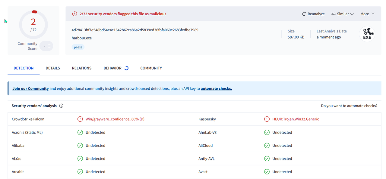 Закинул ехе-ник на сайт https://www.virustotal.com/gui/file/4d28413bf7e548bd54e4c1642b62ca86a2d5839ed36fbfa060e2683fedbe7989