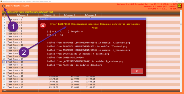 Перетащил код из примера к себе в новую программу. Очередной вылет на ТСБ: Error BASE/1068 Неверный аргумент: Неверное количество аргументов Args: [1] = A { ... } length: 15 [2] = U --------------------------------- Stack Trace --------------------------------- Called from TSBROWSE:BDATAEVAL(1975) in module: h_tbrowse.prg Called from (b)TSBROWSE(1395) in module: h_tbrowse.prg Called from TSBROWSE:SETGETVALUE(0) Called from (b)TSBROWSE(1399) in module: h_tbrowse.prg Called from TSBROWSE:GETVALUE(0) Called from (b)EVAL(345) in module: 0Main.prg Called from TSBROWSE:DRAWSELECT(4859) in module: h_tbrowse.prg Called from TSBROWSE:DRAWSUPER(5024) in module: h_tbrowse.prg Called from TSBROWSE:PAINT(11232) in module: h_tbrowse.prg Called from TSBROWSE:DISPLAY(3507) in module: h_tbrowse.prg Called from _ENDTBROWSE(624) in module: h_tbrowse.prg Called from _TBROWSE(786) in module: h_controlmisc2.prg Called from FORMTABLE12(113) in module: form_Table12.prg Всё вроде правильно перетащил, а вылетает... И как найти где что забыл добавить в ТСБ ? Смотрел исходник h_tbrowse.prg, ничего не понял, где ставить трассировку не понятно... Строка 113 oBrw := _TBrowse( oTsb, cAls, cBrw, owc:nTsbY, owc:nTsbX, owc:nTsbW, owc:nTsbH )