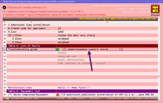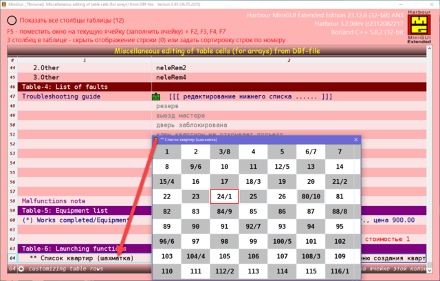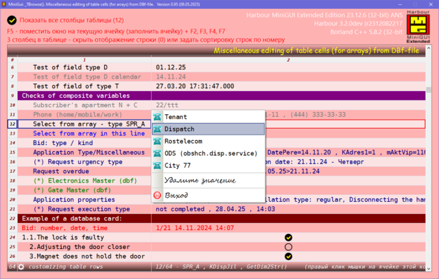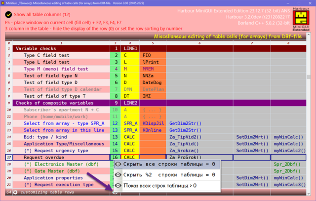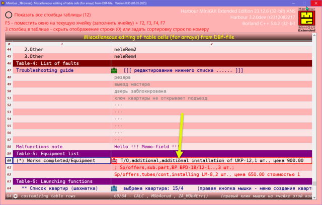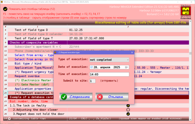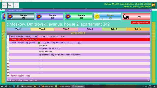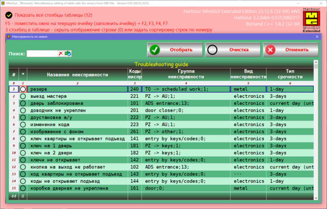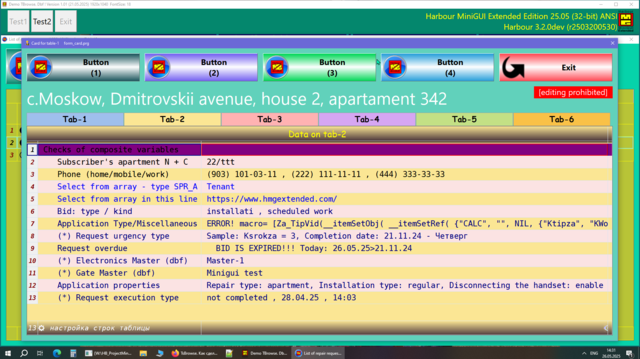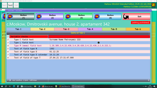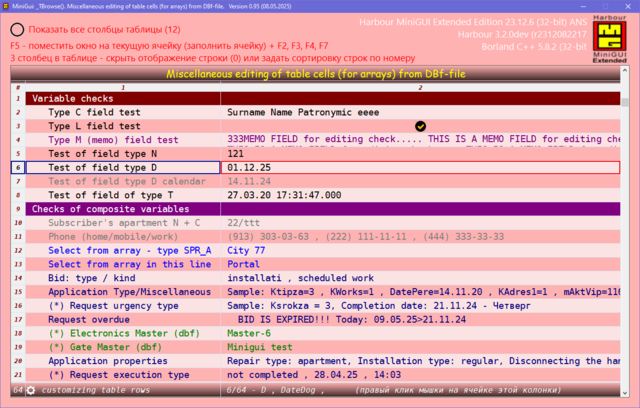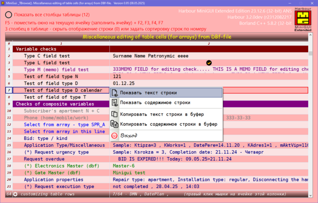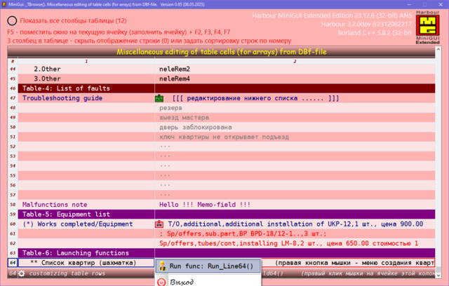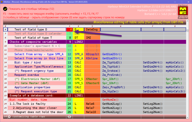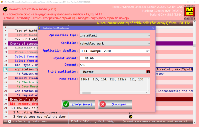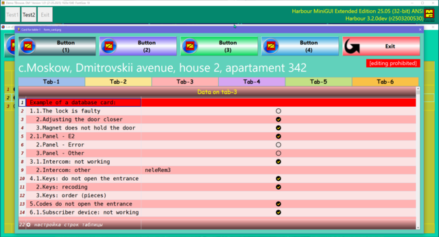 Решил поделиться опытом, может кому пригодиться. Давно была нужно сделать УДОБНУЮ карточку для юзера в МиниГуи. Много вариантов сделал, и на TAB объекте и другие разные варианты. Смотрел что делал Сергей на TSB, не устраивали эти варианты. Сергей натолкнул на мысль как это можно сделать. ОГРОМНОЕ СПАСИБО ему за терпенье и помощь в создание этого примера. Идея простая, считываем одну запись dbf-базы в ТСБ на основе массива и вот карточка юзера готова. Причём на одну строку можем считать несколько десятков полей базы. В качестве примера сделан поиск/фильтр по массиву и фильтр по базе oBrw:FilterFTS() Компактный и удобный вид карточки. Вот внешний вид карточки: Вот поля и функции из базы в массиве, причём 3-колонка это порядок показа и сортировки строк показа юзера, он сам редактирует эту колонку: сортировка сохраняется в ини-файле GetUserTempFolder() + "\tmp_SortUser.ini" Сделано редактирование ячеек таблиц разное: Можно писать и свои функции окон ввода, добавив свою обработку строки таблицы: Или такое: Или такое: Или такое: Исходники отправлены Григорию.